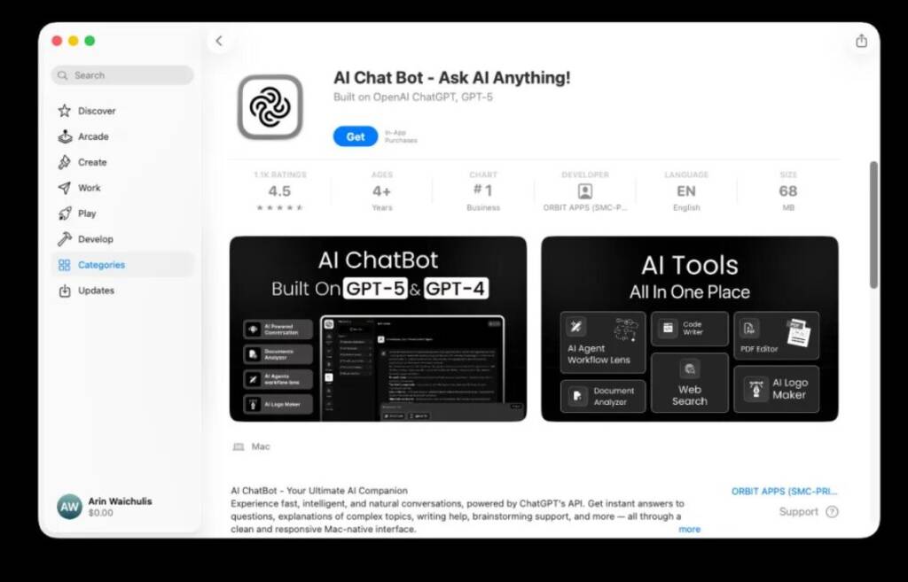 Однак цього тижня дослідник кібербезпеки Алекс Клебер виявленощо один такий шахрайський чат-бот зі штучним інтелектом під назвою OpenAI посів перше місце в категорії «Бізнес» — хоч і менш популярний Mac App Store, але все ж важливий і вартий уваги. Користувачам слід бути обережними, надаючи особисту інформацію таким програмам.